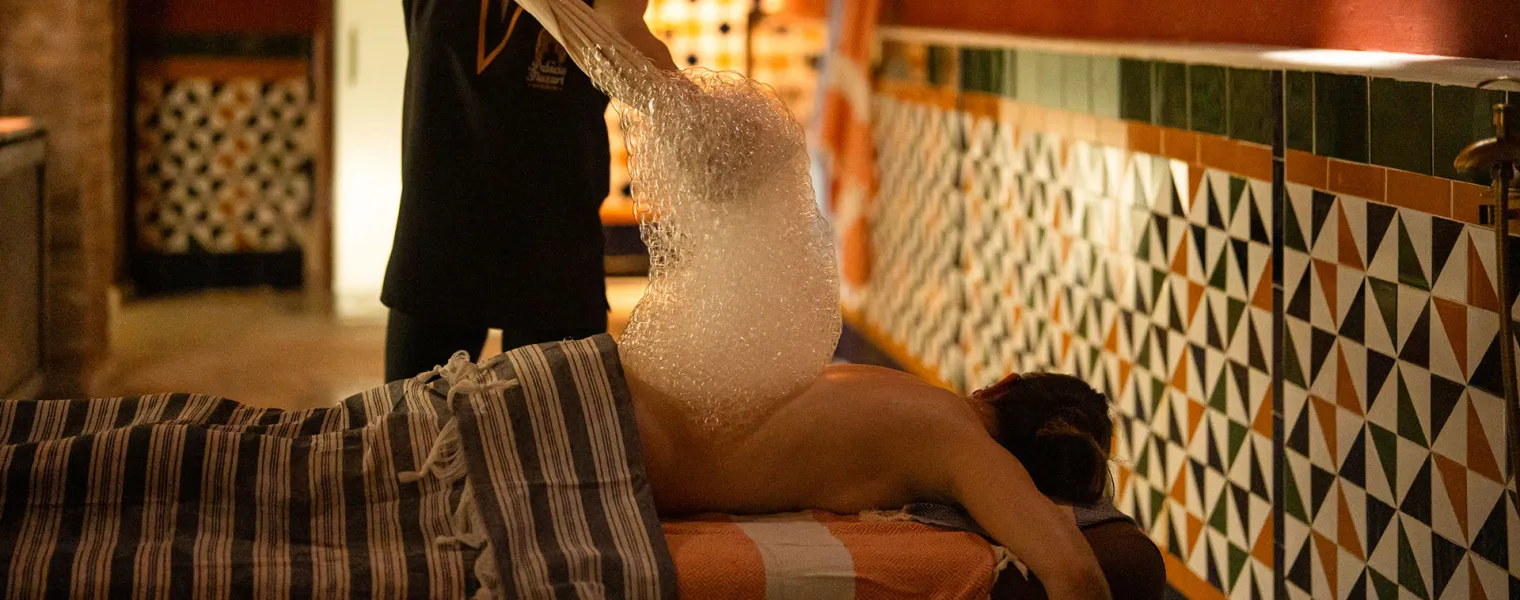 El ritual enriquece tu experiencia con un masaje corporal de 40 minutos realizado con guantes suaves y cremosa espuma de jabón elaborada con gel Nube de Algodón. Un viaje sensorial diseñado para celebrar el amor, despertar los sentidos y dejarse llevar juntos en pareja por la magia del hammam.
